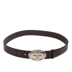 Prada Brown Leather Engraved Oval Plaque Buckle Belt 90CM