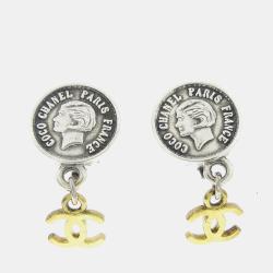 Chanel Medallion Dangle Earrings Gold Silver Clip-On