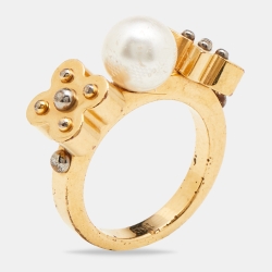 Louis Vuitton Gold Tone Monogram Faux Pearl Ring S